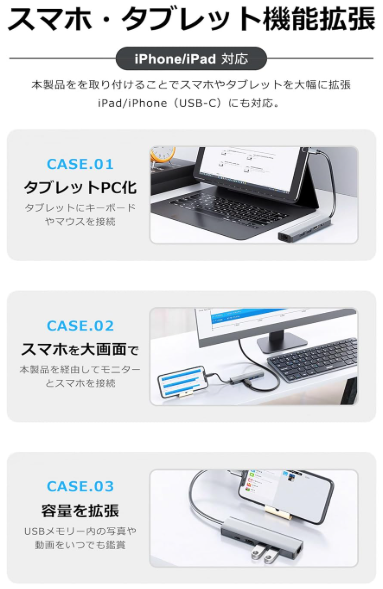 iPhoneやAndroidのタブレットなどのUSB-Cに接続するアダプターで、